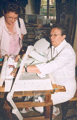 | Marie-Jeanne Houdin avec des créations originales en dentelles à l'aiguille figuratives | Venue de Russie (4 jours et nuits de bus) pour nous présenter ses broderies extraordinaires comme savent encore les faire nos amies Slaves, c'est Melle Kolodkina. |